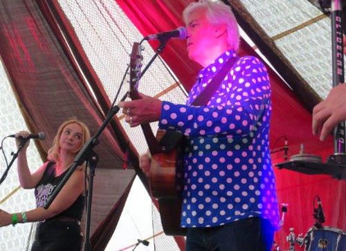 With the chorus to Pristine ringing in our ears we race to the opposite side of the site to sit at the feet of the mighty Robyn Hitchcock, sporting his now trademark dotted shirt. But get this fashion fans, no white spots on black today, no it’s white spots on BLUE.